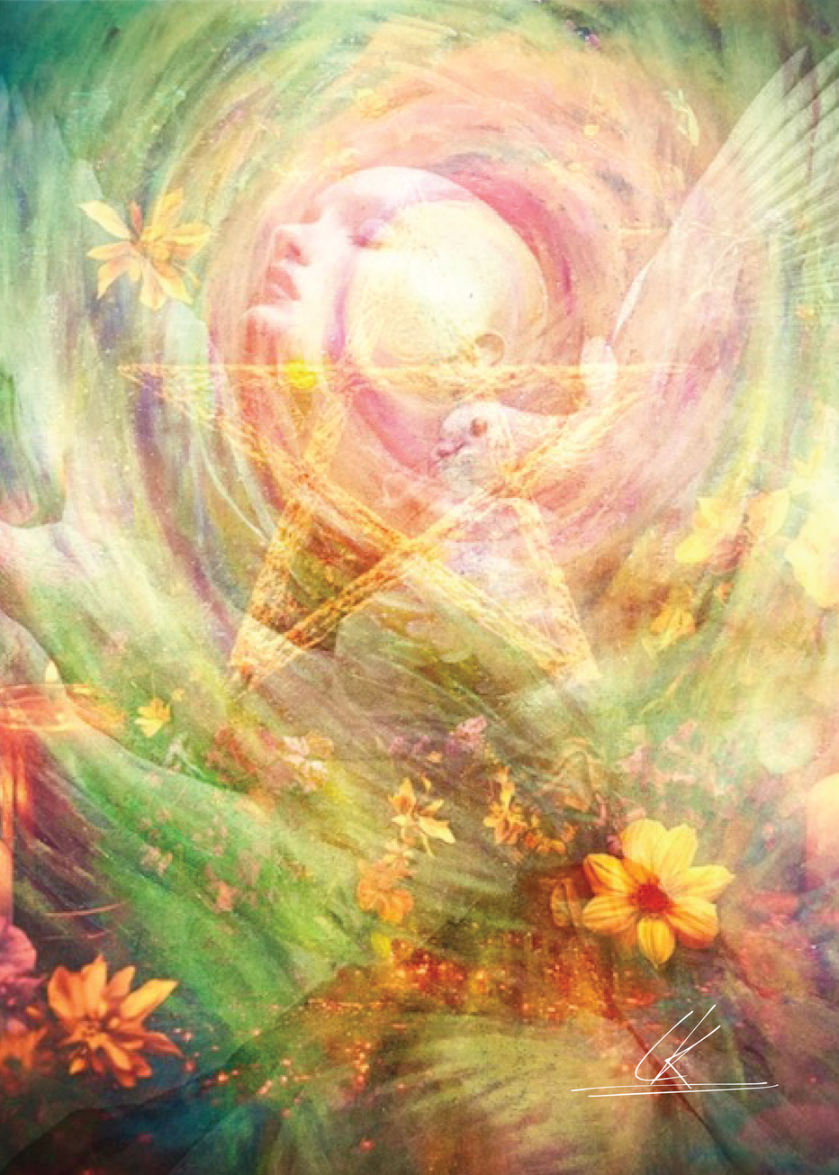 A soft face drifts within swirling greens and warm florals, symbolizing surrender, emotional healing, and the slow return to inner wholeness.